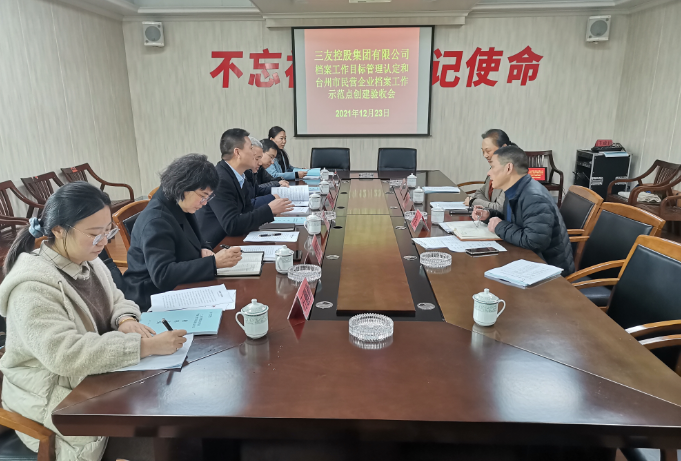 2021年12月23日,台州市档案馆副馆长李友斌一行4人,在路桥区档案馆副馆长罗邦鑫等两人陪同下,来公司开展浙江省档案管理先进单位复评和台州市民营企业档案工作示范点创建验收。集团公司档案室负责人、三友进出口有限公司总经理蔡建美、集团公司办公室主任徐金山等相关人员参加了会议。